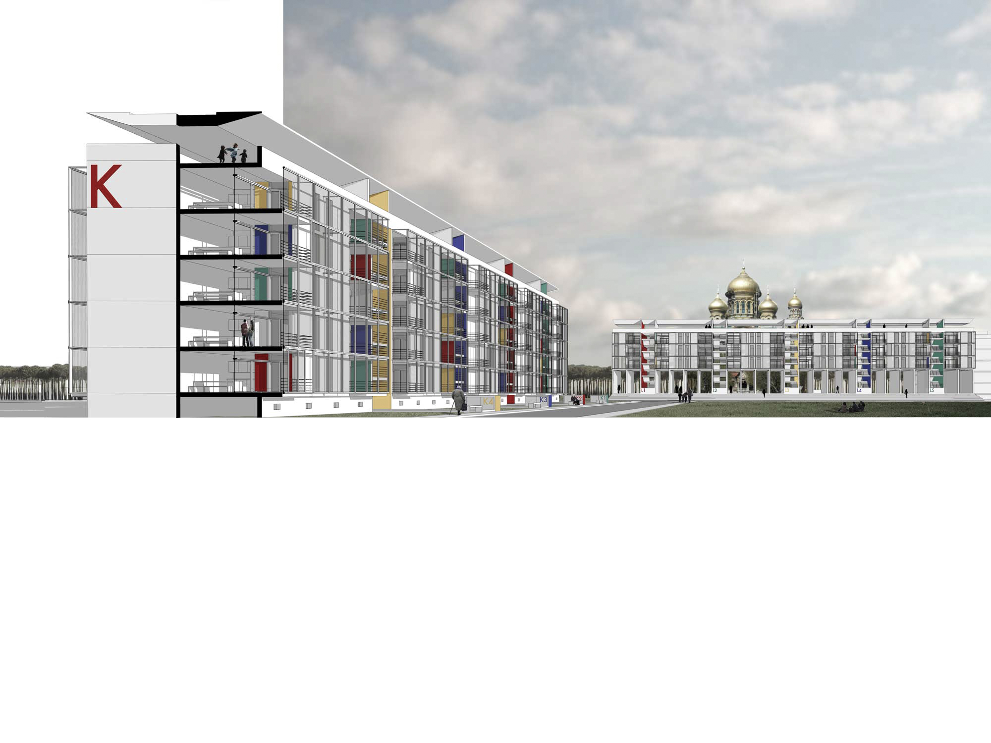 A space-lift rather than just a face-lift, this design was not shortlisted among an array of typical make-up design cartoons. For the crude Soviet realist housing of the abandoned former secret naval base of the cold war in Latvia, an international jury could not help but prefer typical late period pastiches over facades that register chances for real housing plan improvements as contributions to inhabitants. Simply adopting this brutalist prefabricated concrete panel system is a lost chance at times when the superficial weighs more than in-depth qualities of space and light.