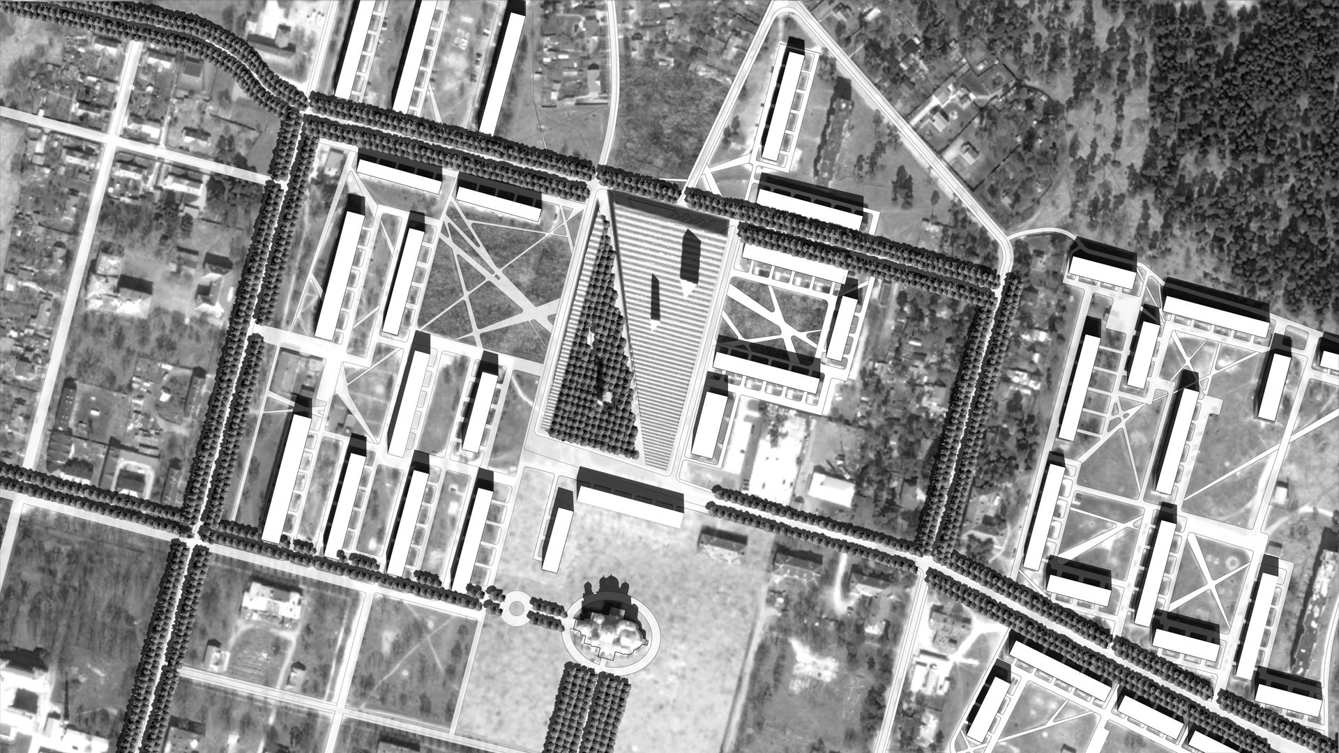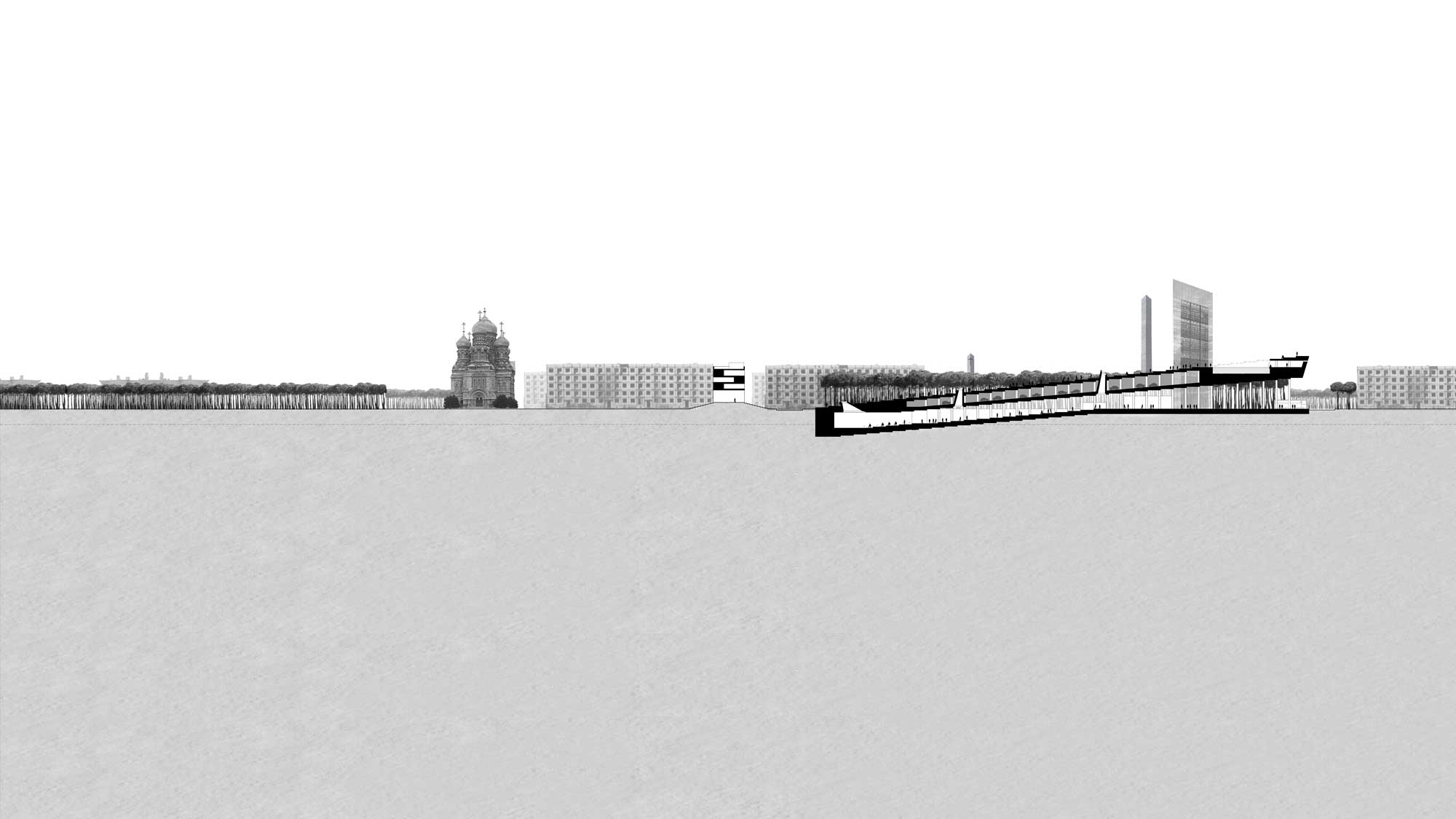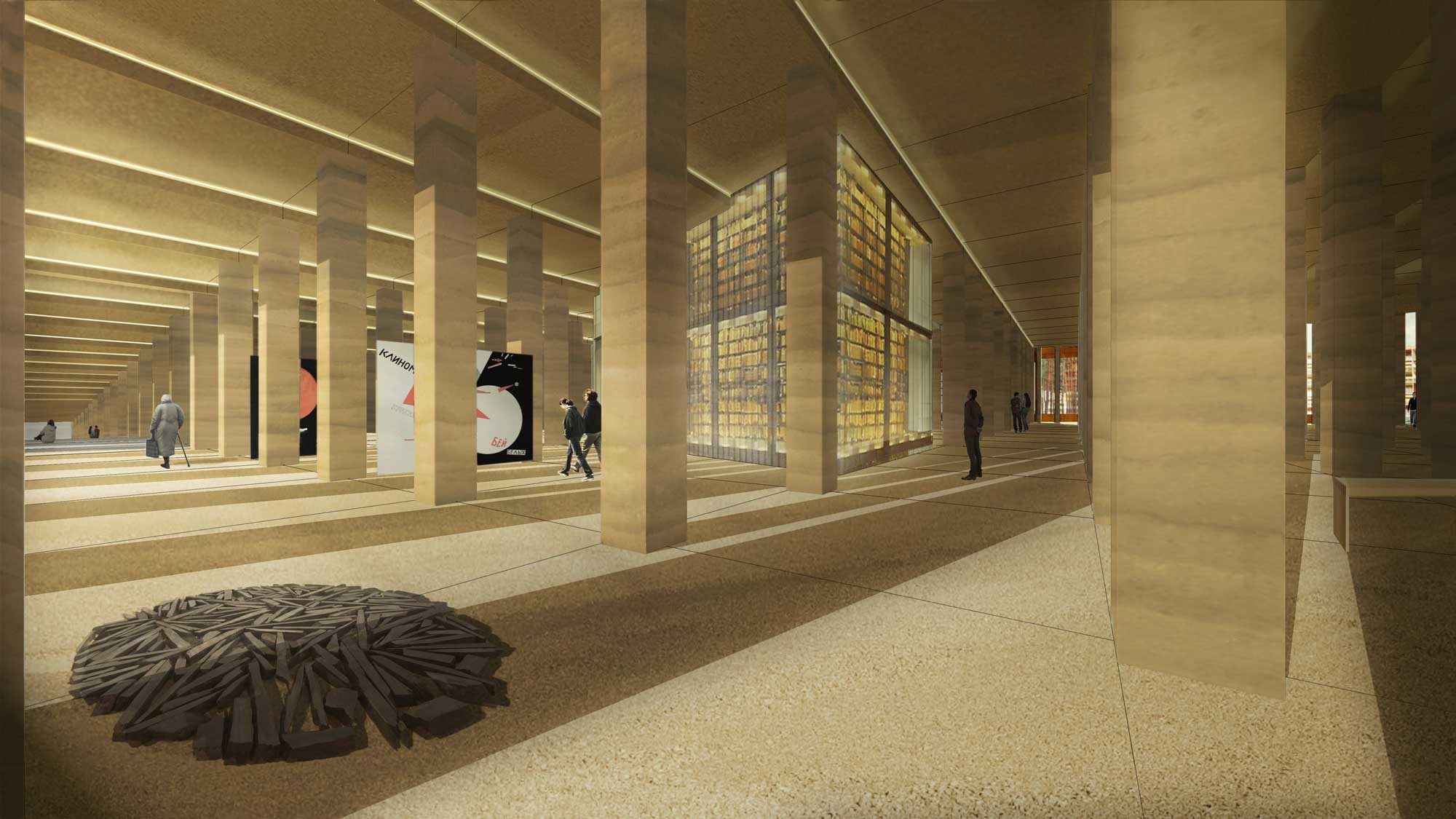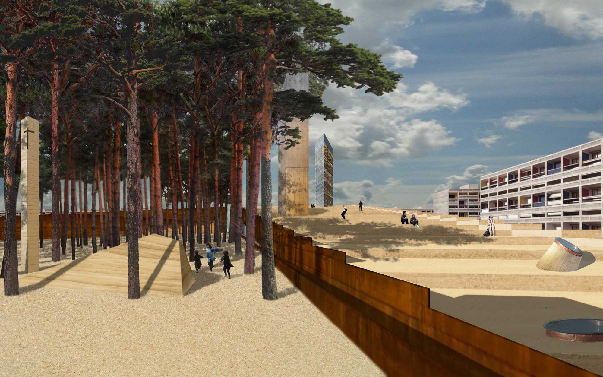 This international competition finalist for a forum in the ghost town of a former cold war Soviet secret naval base on the Baltic Sea coast of Latvia is a contextual project. It makes a place providing an urban oasis with an urban orchard, an ascending place of a stair square above the descending space of a grand hypostyle, and as an urban oasis defies typical contemporary obsessions with dropped object-making.