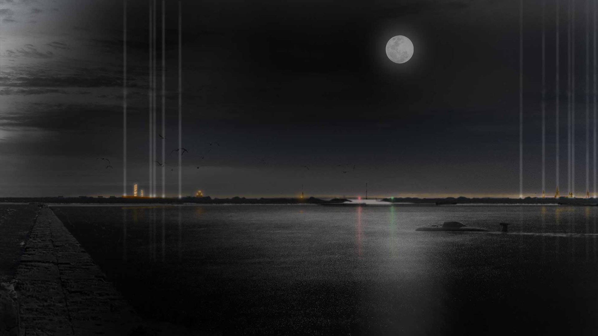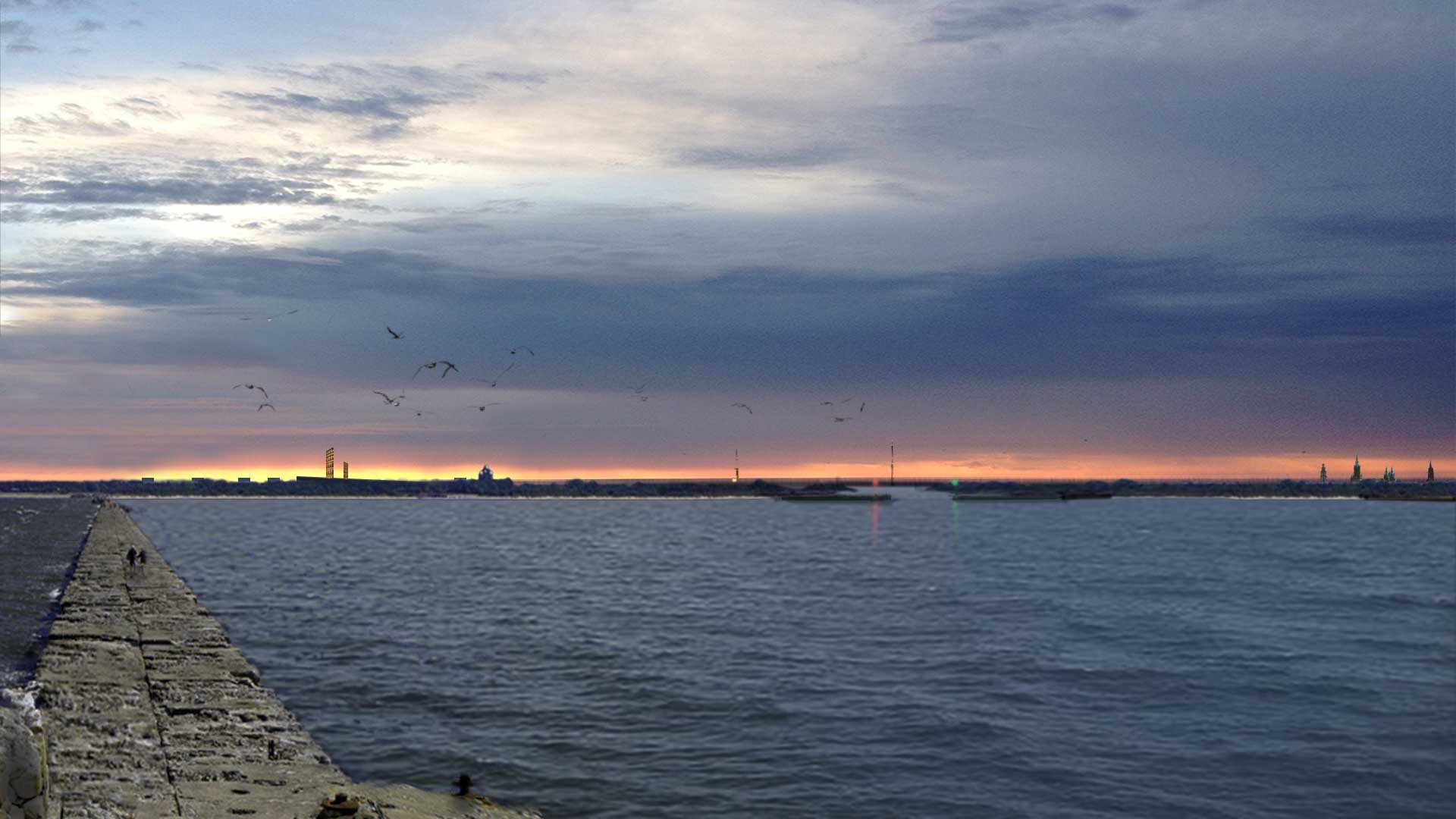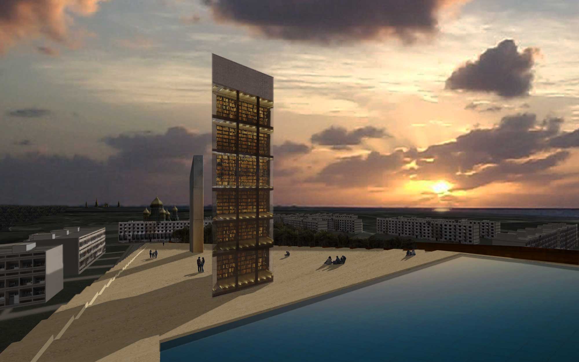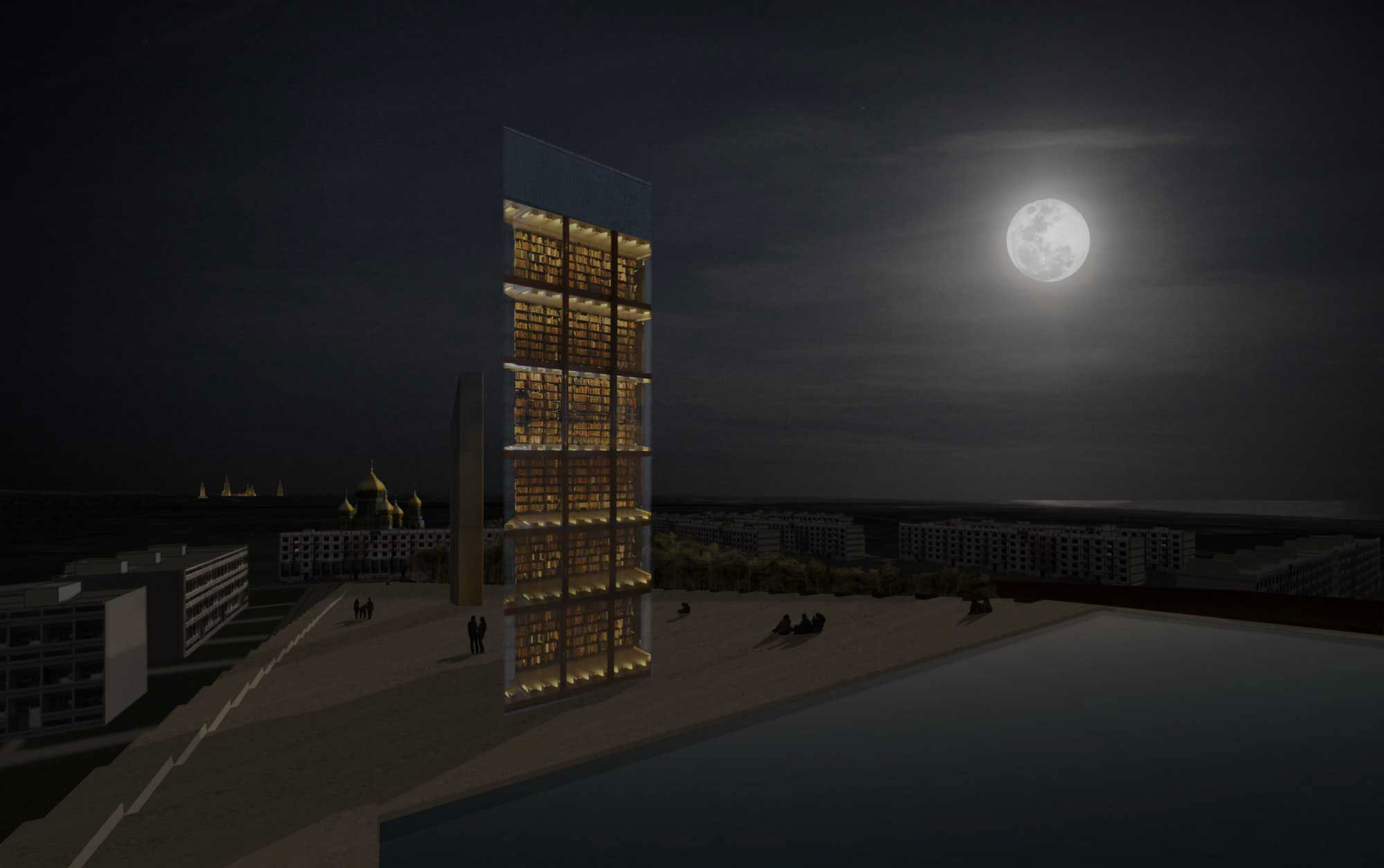 This international competition finalist for a forum in the ghost town of a former cold war Soviet secret naval base on the Baltic Sea coast of Latvia is a contextual project. It makes a place providing an urban oasis with an urban orchard, an ascending place of a stair square above the descending space of a grand hypostyle, and as an urban oasis defies typical contemporary obsessions with dropped object-making.