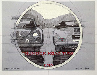 The Thunder Road Tubs are a Tennessee hot rod group founded in 2010. These aficionados are all about essential early Porsche cars. An epic 1958 filme noire titled Thunder Road, starring Robert Mitchum, sets an epitaph to a local crime drama during the days of moonshine runs with outlaw cars, serving as a style palimpsest for the group's car purism. Hansjörg Göritz, who had joined this group early, had the pleasurable honor of a thorough graphic design to provide the matching logo badge capturing this cultural context.