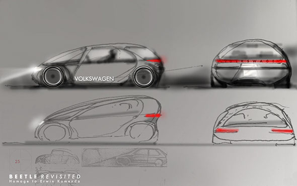 New New Beetle? People's Car. There is a difference of styling and design. If retro-style is nothing more than a second brew of yesterday, how about design as the fresh brew for tomorrow? This could hardly be more current than at times of heated discussions that the merging of Volkswagen and Porsche causes, eight decades after their founding. Both carmakers' minimalist designs can be traced back to one fine, low-key, and sophisticated genius: Erwin Komenda, the unsung hero of the first Volkswagen and early Porsches. The early 1930s state-of-the-arts streamline designs of this engineer became timeless million sellers and design icons. Late 1960s/early 1970s designs of the first Golf and the 914 VW-Porsche were literally cutting-edge reinterpretations in their own unique way. Giugiaro's Italdesign Golf opened a new book rather than rewriting old chapters. Today's fusion of companies, that always went and belonged together, sparked Hansjörg Göritz' new Beetle Re-vision, inspired by Komenda's original flow of lines, interpreting Giugiaro's spaciousness, adding a splash of Lapine's first time all-integral shell for the ground-breaking 928.